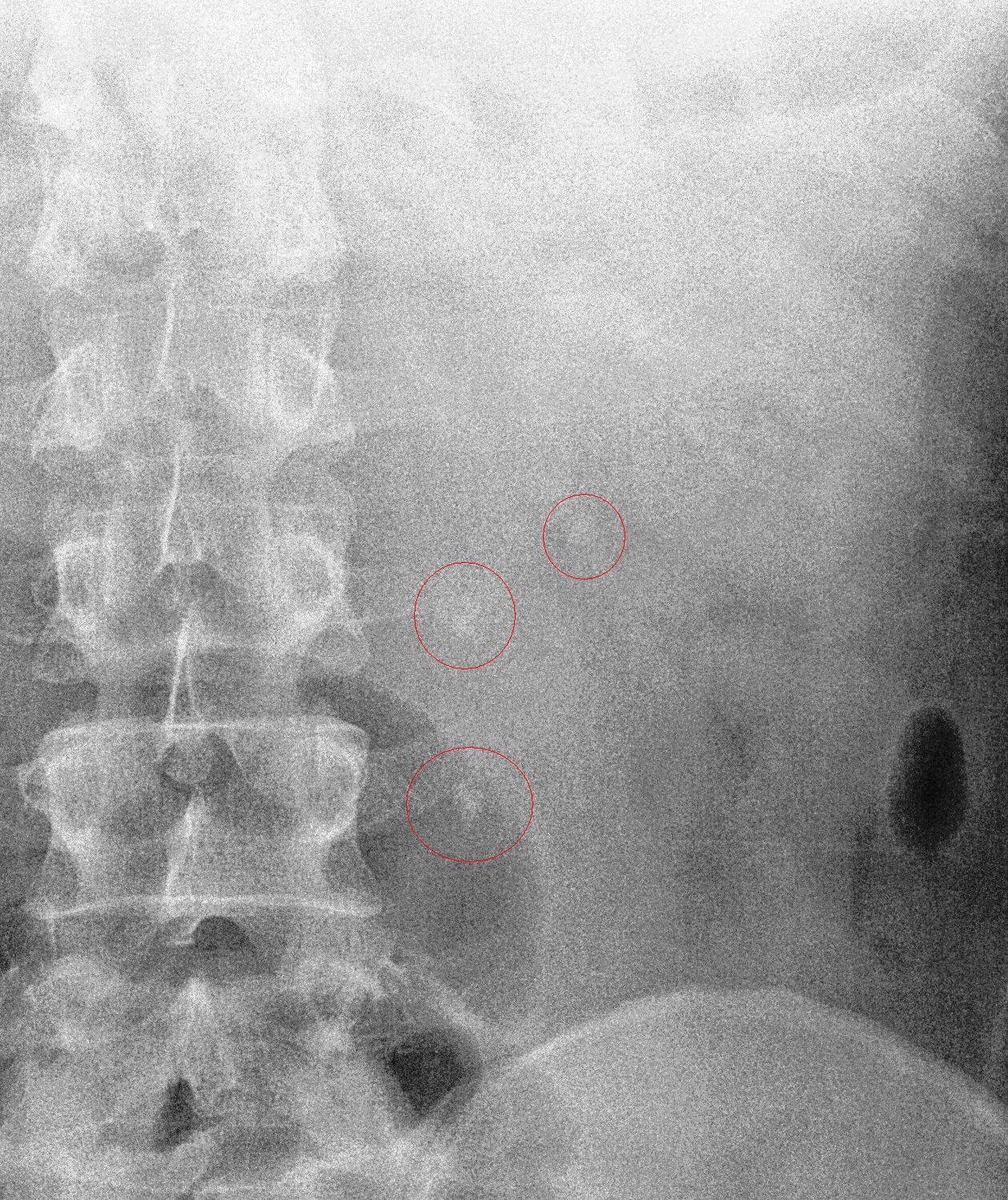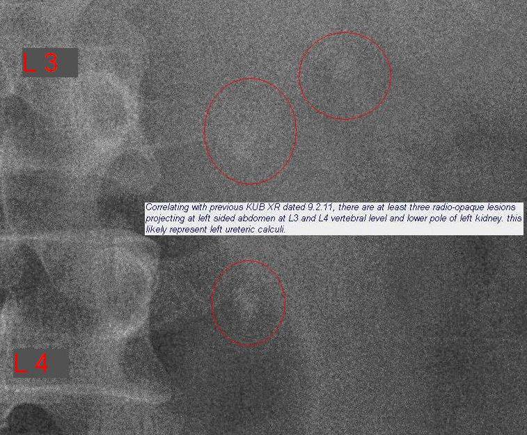But the Urine FEME came back positive for RBCs, so my provisional diagnosis shifted towards urolithiasis. I downloaded the X-ray film and e-mailed it to a surgeon in Hospital Kuala Lumpur. He confirmed my suspicions by replying, “Congratulations, you got triplets!”.
