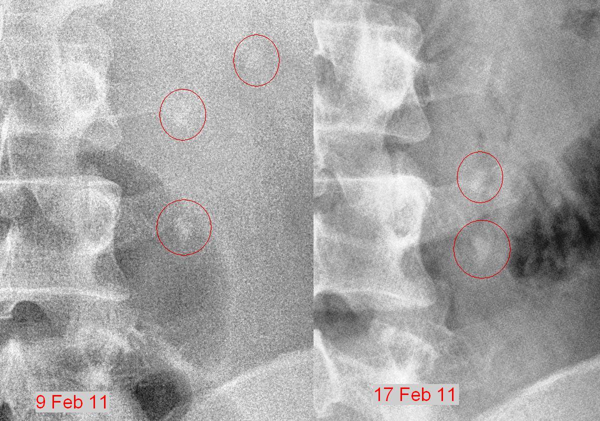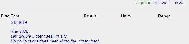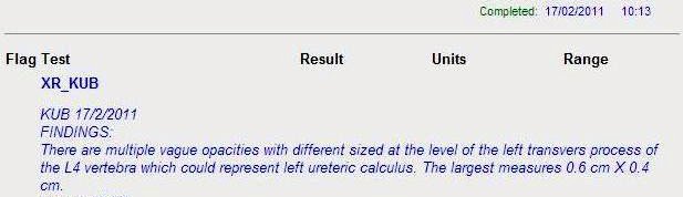 The ultrasound report confirmed the diagnosis. I started treating myself by ingesting potassium citrate mixture 3 times a day to alkalinise my urine. I also had UFEME done regularly to monitor the presence of RBCs in the urine. A week later on 17th Feb, when the RBCs were no longer being detected in the urine, I had another KUB X-ray done.