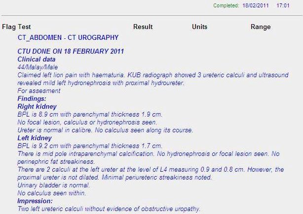 The uncertainty affected me, since a total blockage would cause a back flow of the urine, thereby affecting my left kidney. I consulted the urologists in UKMMC and they told me to get CT urogram done. I managed to get a CT scan done on the very next day on the 18th Feb.