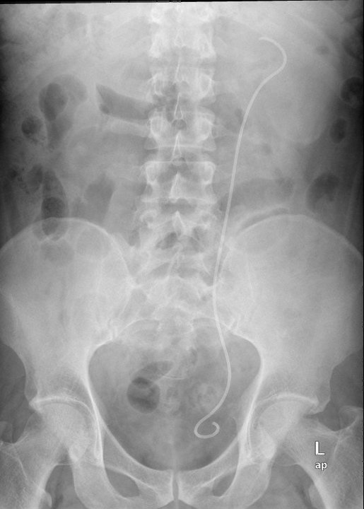After surgery, there was another KUB done to confirm the location of the stent. The stent protects the ureter from any leftover debris of the pulverised stones.